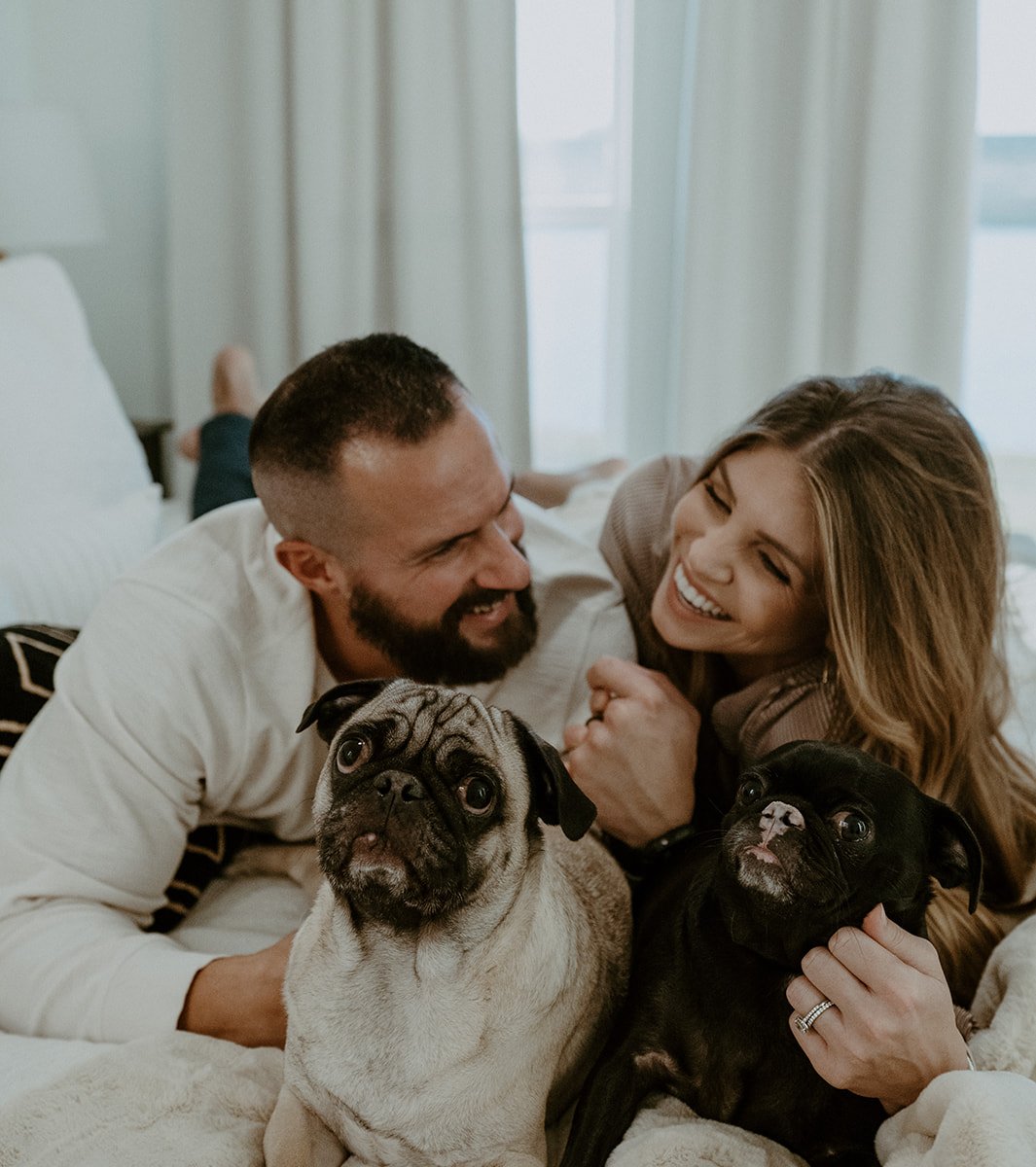Hiii! My name is Kara and my Husband is Adrien. We still consider ourselves newlyweds, as we got married April 16, 2022! We have two pugs, Cal & Cassie, and they are the sweetest little cuddle pugs & our cute besties!